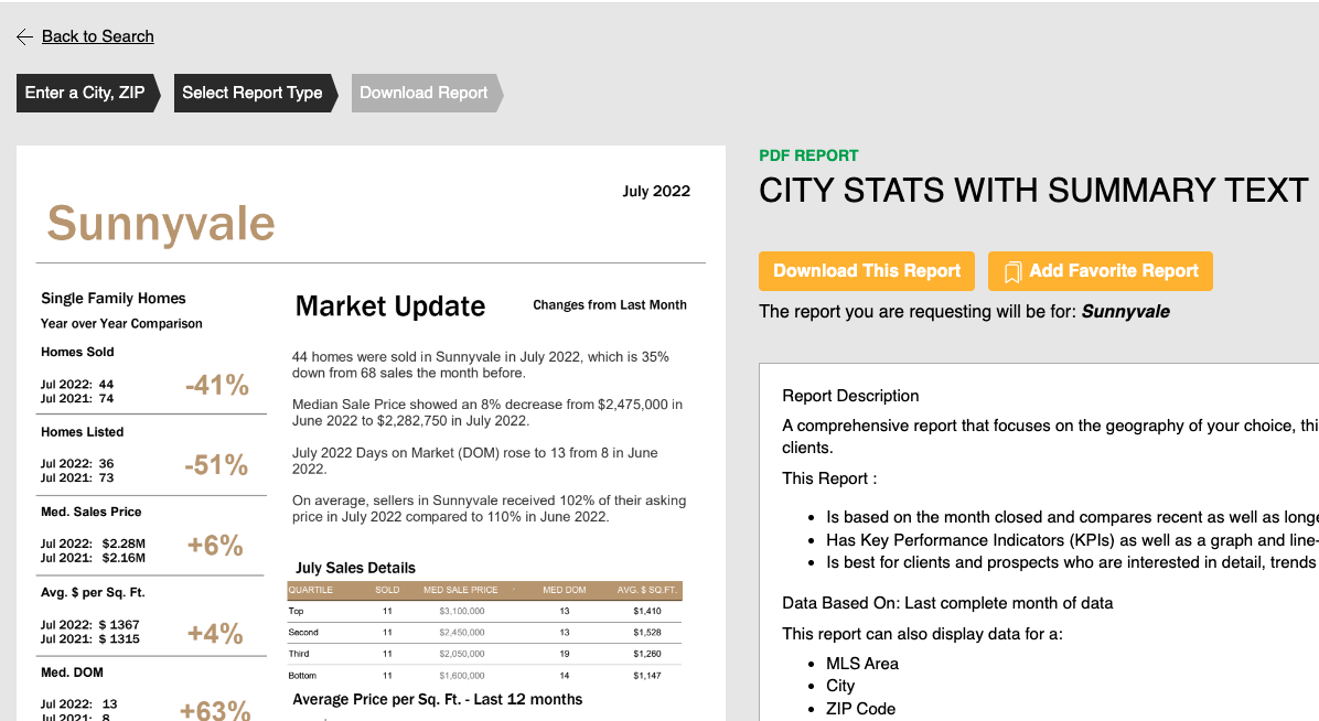 Above are samples of report templates available, demonstrating the value of the talking points for your clients. Not interested in city data? No problem! Pick a ZIP code or MLS area to get the information you are looking for.